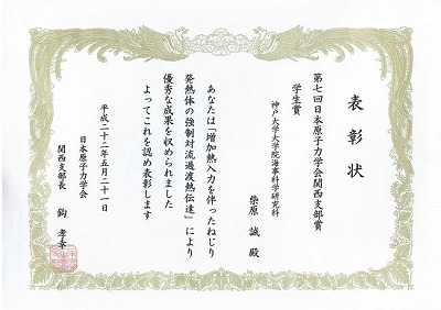 「日本原子力学会関西支部賞学生賞」は、学会・国際会議等において優れた研究発表を行った関西支部管内の学生、又は関西支部の活動に貢献した学生に対して贈られるものです。2010年5月21日に開催された関西支部総会後の懇親会において表彰式が行われ、賞状ならびに副賞が贈られました。柴原誠さんは、熱工学研究室(福田、劉)において平成22年3月海事科学研究科博士課程後期課程を修了。現在、大阪大学大学院工学研究科環境・エネルギー工学専攻量子エネルギー講座特任研究員。