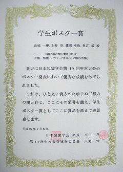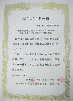 日本包装学会第19回年次大会(2010年7月8〜9日、東京)において、大学院海事科学研究科博士課程前期課程海洋ロジスティックス科学講座の木下侑亮さん、山城一藤さん(指導教員蔵岡孝治准教授)が学生ポスター賞を受賞しました。木下さんの受賞発表は「架橋構造を導入した有機-無機ハイブリッドガスバリア膜の作製」、山城さんの受賞発表は「層状複水酸化物を用いた有機−無機ハイブリッドガスバリア膜の作製」でした。同賞は年次大会で優れたポスター発表を行った学生に贈られるものです。