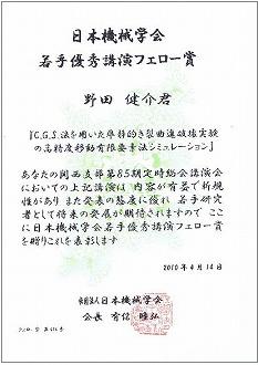 4月14日、大学院海事科学研究科前期課程マリンエンジニアリング講座の野田健介さん(2010年3月卒業、指導教員西岡俊久教授)が、3/15〜18開催の日本機械学会関西支部第85期定期総会講演会において、若手優秀講演フェロー賞を受賞しました(講演タイトル:「C.G.S.法を用いた準静的き裂曲進破壊実験の高精度移動有限要素法シミュレーション」)。