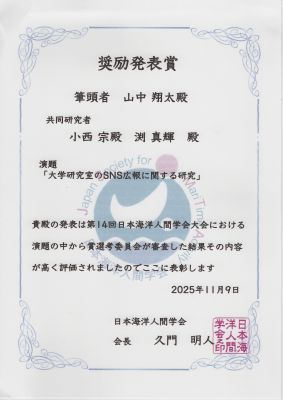 航海学領域4年生山中翔太さん、小西宗助教、渕真輝准教授が、2025年11月8日〜9日に開催された第14回日本海洋人間学会大会において、奨励発表賞を受賞しました。